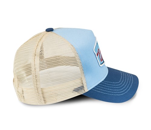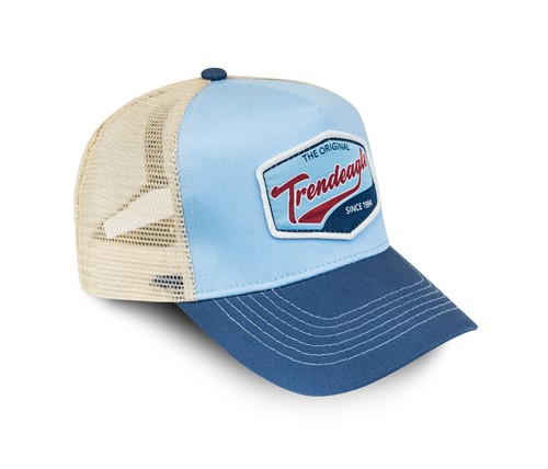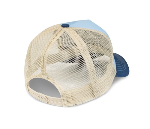 Mikään ei voita sinisen taivaan ja kirkkaan auringon tunnetta... Tai.. Sky ehkä? Klassinen trucker malli beige verkkokankaalla ja etuosa sinistä puuvillatvilliä, aivan kuin taivas. Snapback-muovikiinnitys takana koon säätämistä varten.One size.
